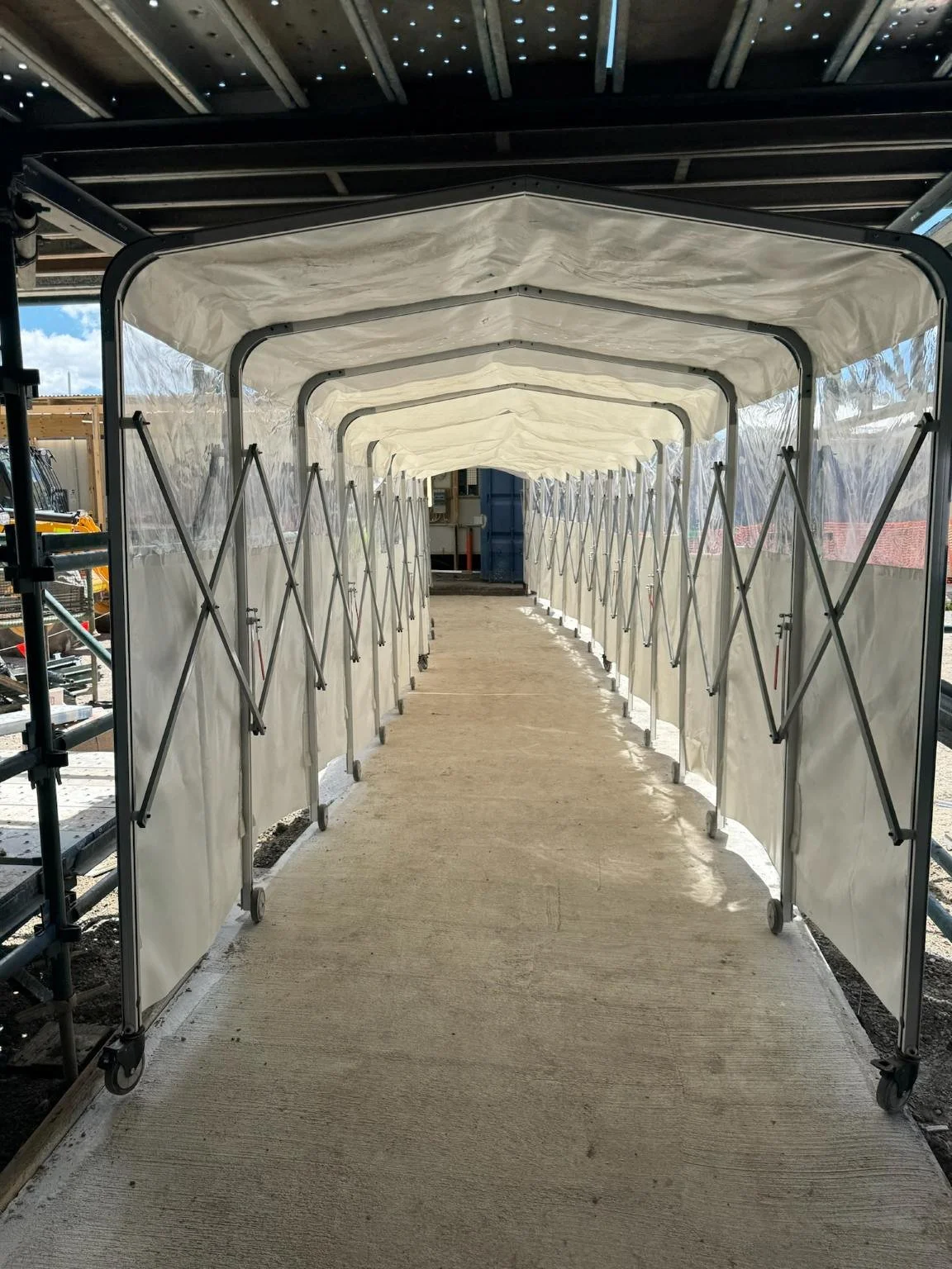 Swift Retract is an innovative retractable aluminium covered walkway system engineered to enhance efficiency on your job site. Boost productivity and ensure safe, dry access paths regardless of weather conditions. Its lightweight, retractable frame enables quick setup, effortless transportation, and convenient storage between uses, making it the ideal solution for seamless site accessibility.